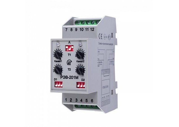 Реле времени РЭВ-201М предназначено для коммутации электрических цепей переменного тока 220В 50 Гц и постоянного тока 24-100 В с регулируемой выдержкой времени. Реле содержит два канала и может работать по одному из четырех алгоритмов работы, задаваемым пользователем. Выдержка времени каждого канала начинает отсчитываться от момента подачи питания на канал. Реле позволяет обеспечить два режима работы каналов: - Режим 1. Независимая работа каналов. На каждый канал подается разновременно независимое питание. Выдержка времени отсчитывается от момента подачи питания на каждый канал (режим двух реле); - Режим 2. Параллельная работа каналов. На каждый канал одновременно подается одно и то же питание. Отсчет времени по обоим каналам начинается одновременно. Время срабатывания соответствует выставленным с помощью регулировок задержкам для каждого канала (режим одного реле с двумя выходами и разными выдержками).